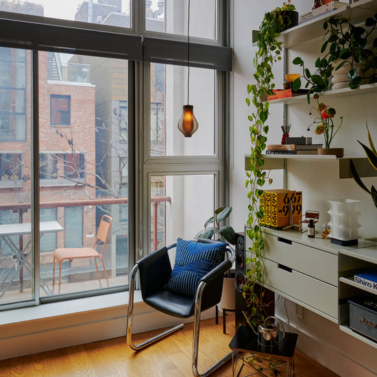 The Baleine Pendant is a plug-in, renter-friendly style, featuring an extra long cord and two brass swags for easy install and variable configuration.