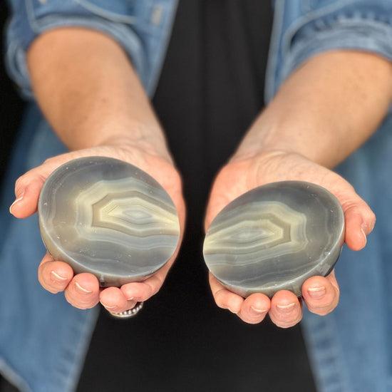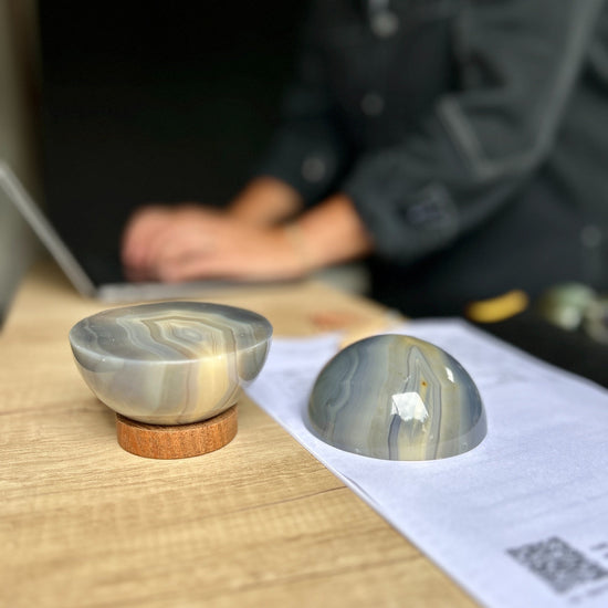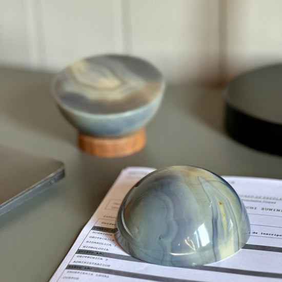 Add warmth and grounding energy to your workspace with this beautifully crafted jasper paperweight. Made from a natural jasper sphere sliced into two half-spheres, this set includes one for practical use as a paperweight and another as a decorative accent resting on a hand-carved carob wood base.